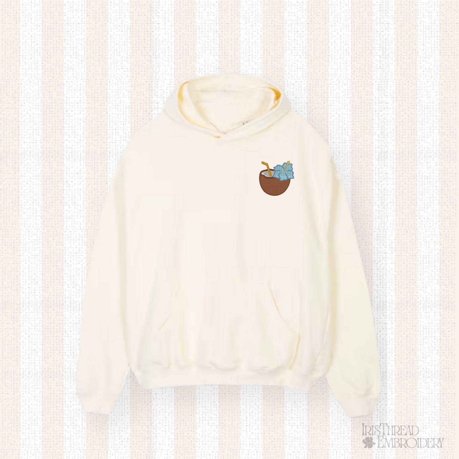 This tropical coconut drink design is perfect for summer stitching. It adds a fun, vacation-ready touch to tees, hoodies, hats, and more.