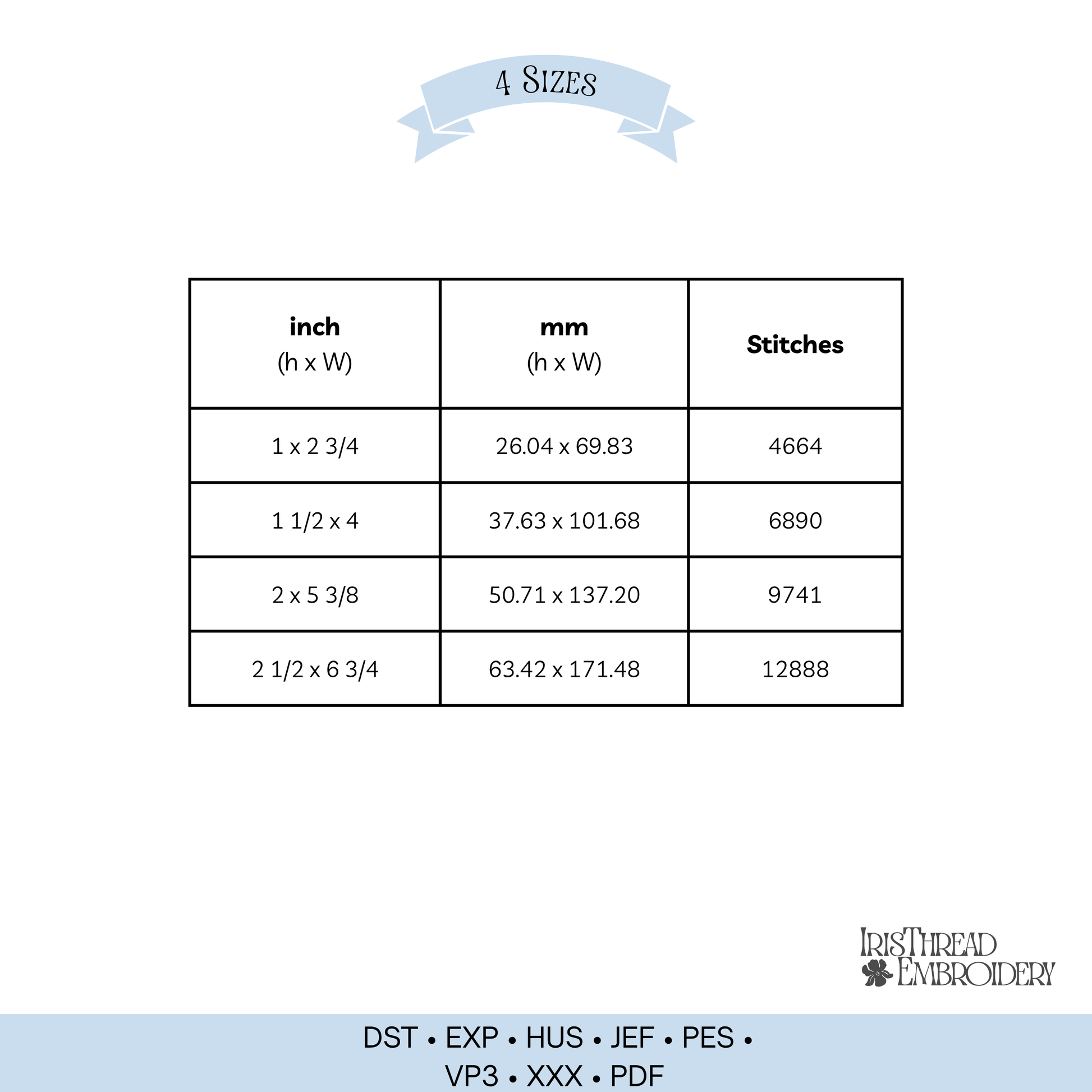 You’ll get 4 sizes to fit a range of hoops, and the file includes multiple formats like PES, DST, and EXP.