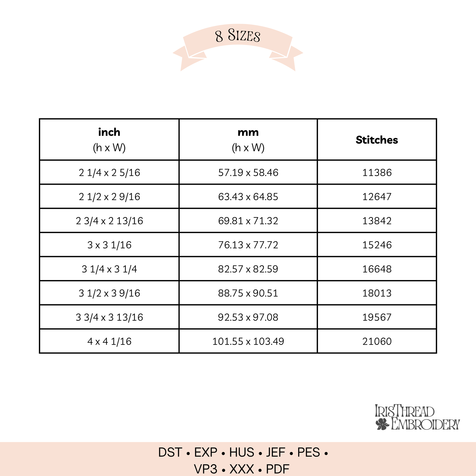 You’ll get 8 sizes to fit a variety of hoop sizes, and the file comes in multiple formats like PES, DST, and EXP.